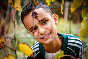 ‘Mijn moeder helpt me graag om er zo eng mogelijk uit te zien.’ Nino heeft speciaal voor het interview een gruwelijke wond op zijn voorhoofd zitten, gemaakt door zijn moeder met vaseline, bloem en foundation.